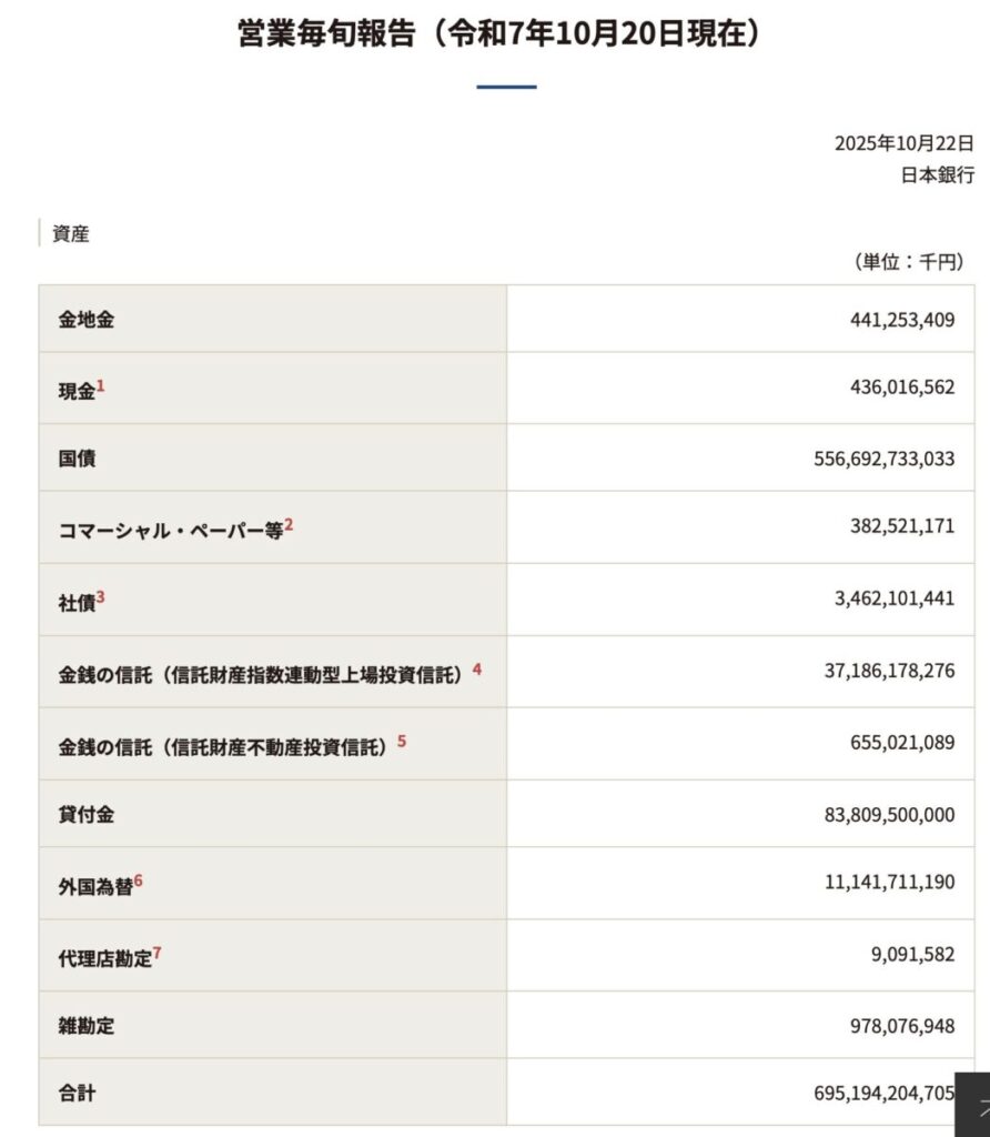さて、日銀のバランスシートの資産側を見てみましょう。この記事を執筆している時点で最新の2025年10月20日現在のデータです。総額約700兆円のうち、4400億円程度を占めている「現金」という項目があります。この記事の話題はこちらの正体です。