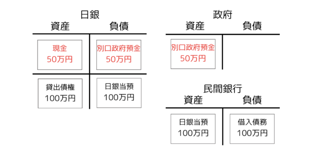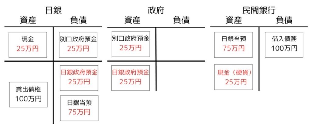 ここで、日銀全体の資産と負債はバランスしていますが、別口に関しては、資産が25万円減った25万円の「現金」、負債が50万円の政府別口預金でバランスしていません。これをバランスさせるように、なんと、政府別口預金から25万円が通常の(政府が支出できる)日銀政府預金に振り替えられるというのです。その結果は以下のようになります。