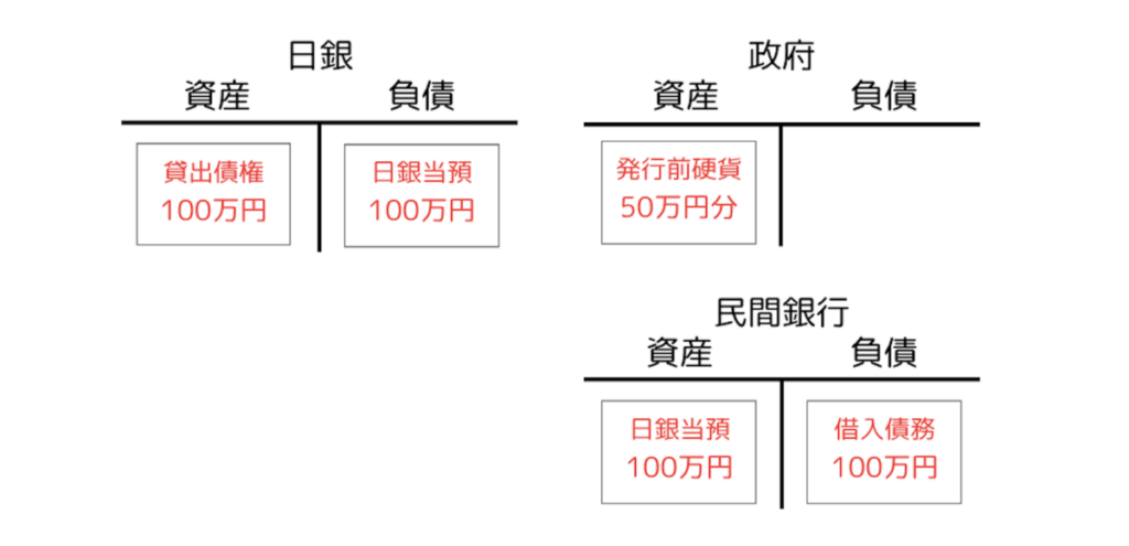 さて、気を取り直して、正式な日銀用語における「現金」の会計的取り扱いを見ていきましょう。いま紹介した私の記事のいつもの作法にしたがって、日銀から民間銀行への100万円の貸出が行われている時点から出発します。また、政府は50万円分の発行前硬貨を製造しているとします。この時点では、まだそれはお金ではありません。これを図にすると以下のようになります。