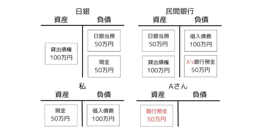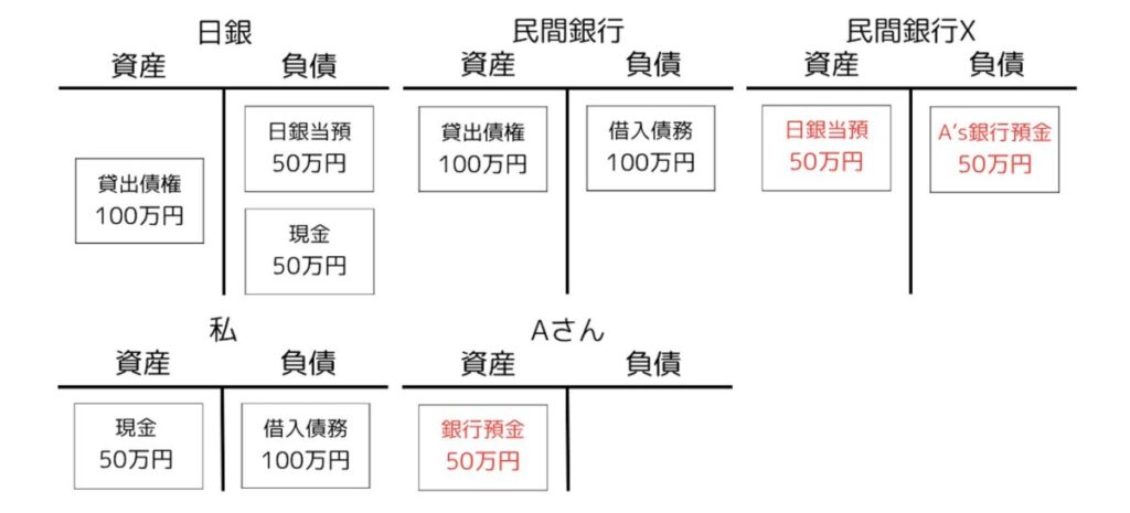 別の銀行にある場合は、銀行における私の口座残高がなくなり、別の銀行(民間銀行X)のAさんの口座に残高50万円が生まれます。ただ、このとき民間銀行Xとしては引き出しや振り込みに応じなければならない負債がいきなり50万円増えてしまったわけで、それだけでは釣り合いが取れません。そこで、私の銀行から民間銀行Xへと資産の日銀当座預金50万円が移ることとなるのです7。