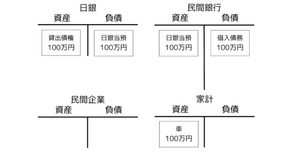 ここがポイントです。工事の発注に伴い民間企業の資産となる銀行預金100万円が生じ、ということは民間銀行は銀行預金100万円という負債を抱えることになるので、それを埋め合わせる形で政府から資産である日銀当座預金が振り替えられるのです9。