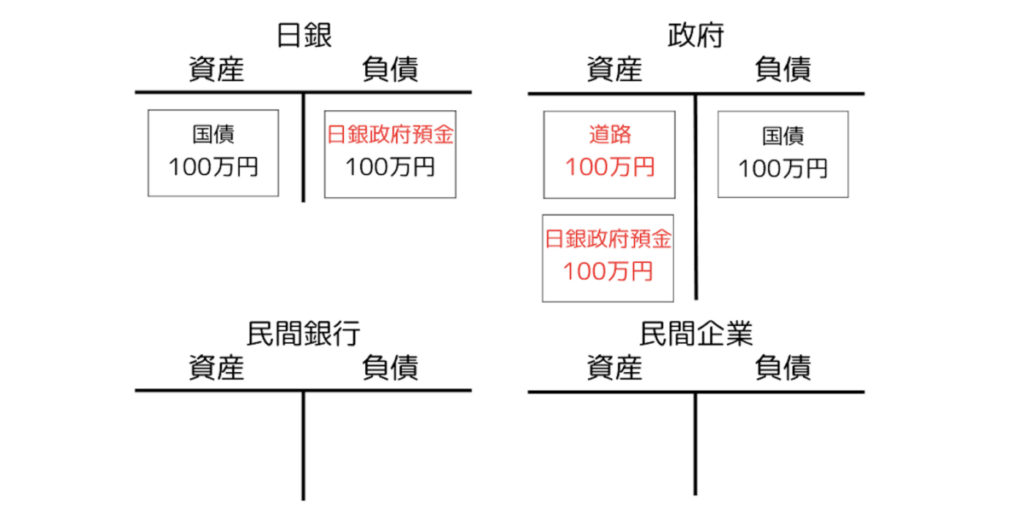 この100万円を使って、政府が民間企業に道路建設を発注したとしましょう。すると、道路建設の報酬として民間企業の銀行預金100万円が生じます。ということは、その民間企業が口座を持っている銀行は銀行預金100万円という負債をいきなり抱えることになります。それを相殺するように、日銀の負債のレベルにおいて、政府の資産としての日銀政府預金が銀行の資産としての日銀当座預金に振替られます。