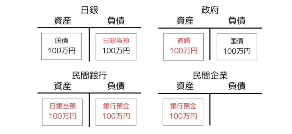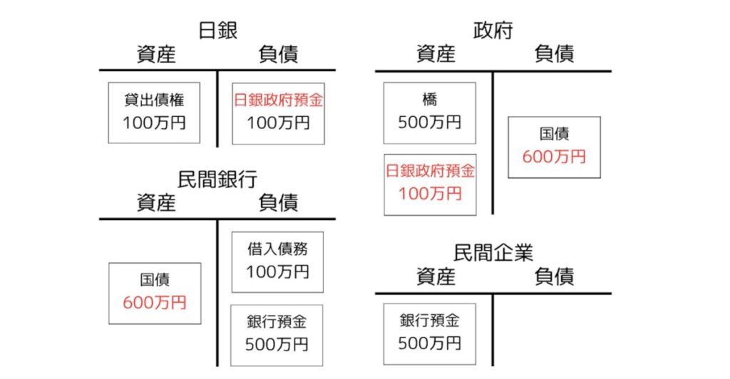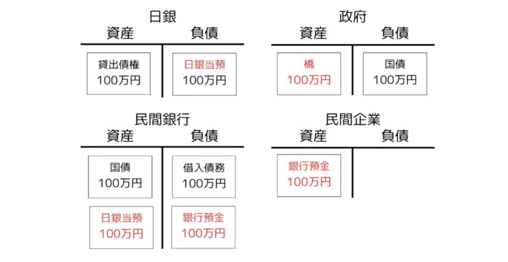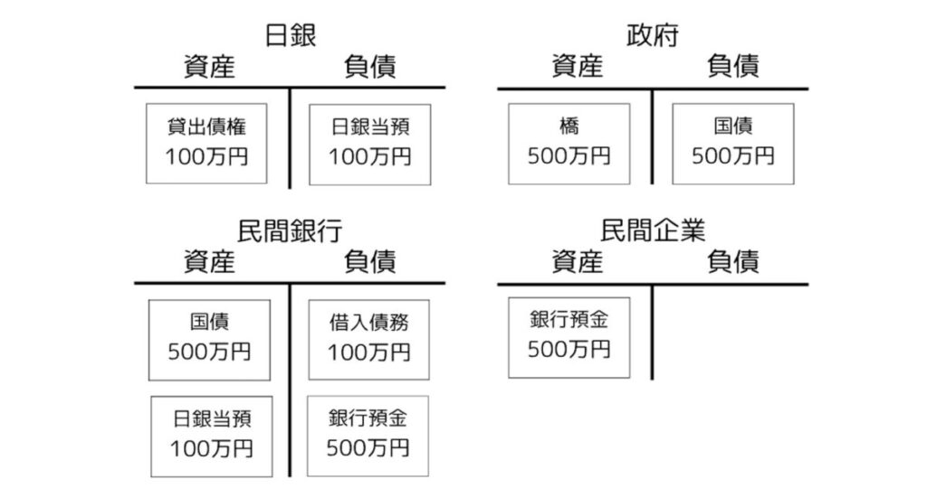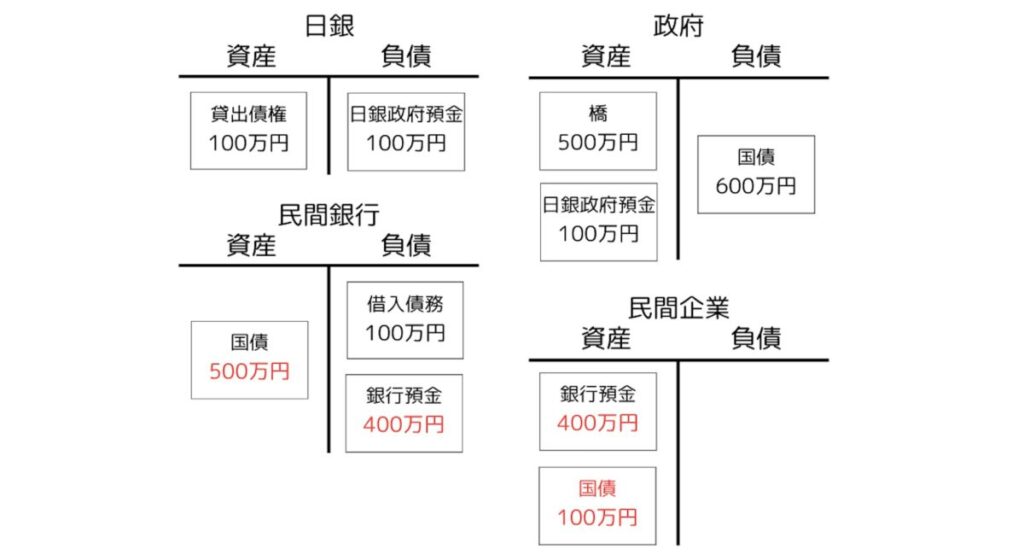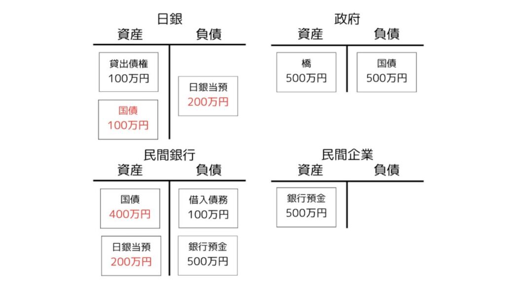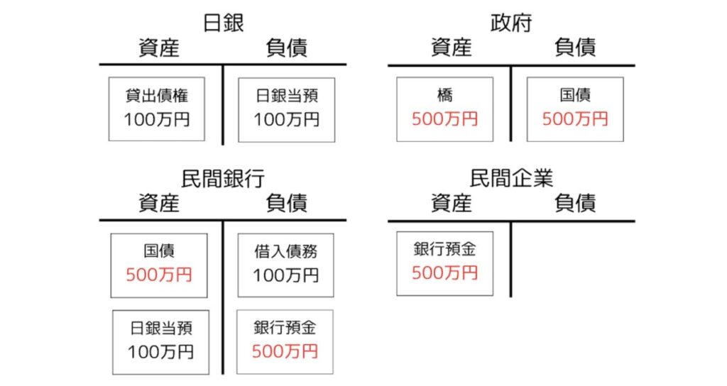 今回は民間企業と家計の口座が同じ銀行にあり、また現金引き出しもなかったため、日銀と日銀当座預金には実質的に出番がなかったことにも注目しておきましょう。現金引き出しも他銀行への振り込みもなければ、これらに出番はないのです。