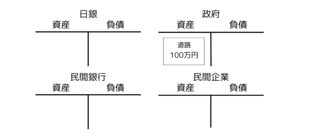 さて、ここで企業はこの100万円で家計に属する人を雇って、たとえば、車を生産することにしましょう。生産設備や素材はすでに揃っていることとします。これにより、民間企業の資産である100万円の銀行預金が労働の報酬、つまり賃金として家計に渡り、その代わりに民間企業は在庫資産として100万円の車を得ます。民間銀行に変化はありませんが、負債の銀行預金の名義は民間企業から家計に変わっています。