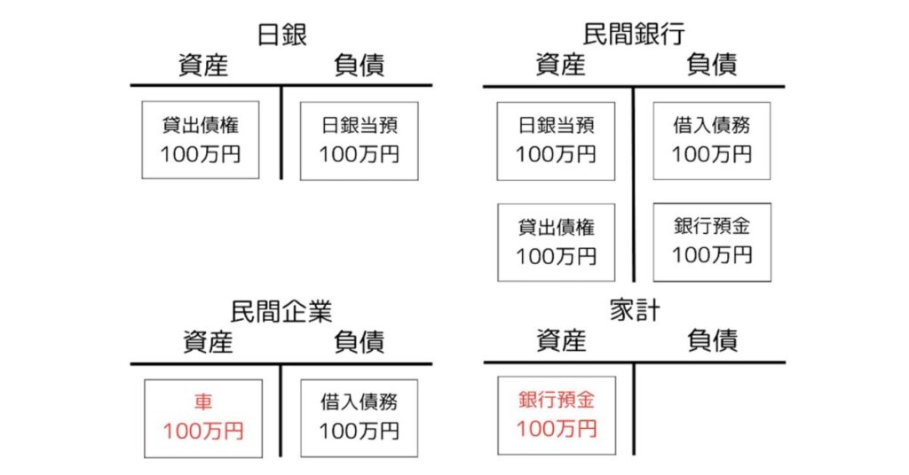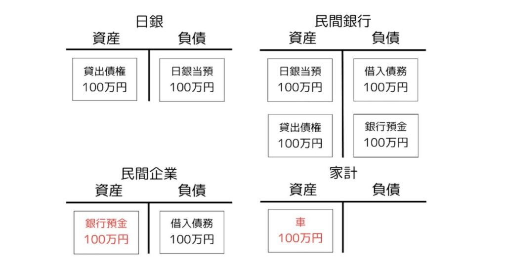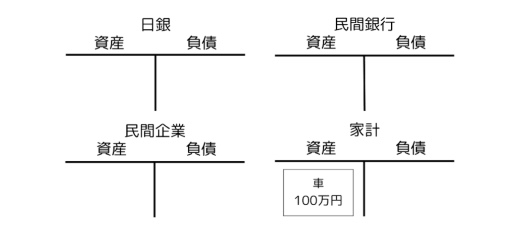 この車を誰に売りましょうか。いまお金を持っているのは家計だけです。この家計に買ってもらうことにしましょう。すると、家計の銀行預金が車の代金として民間企業の銀行預金に変わり、逆に車が家計の資産となります。民間銀行の負債の銀行預金の名義はまた民間企業になっています。