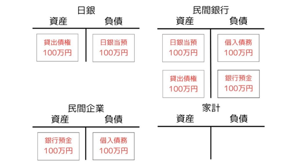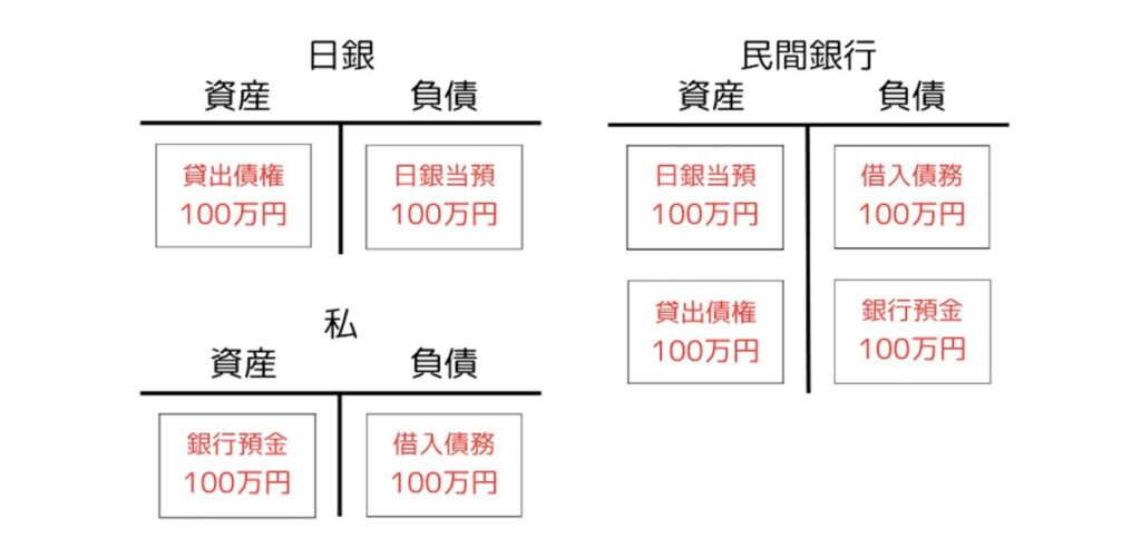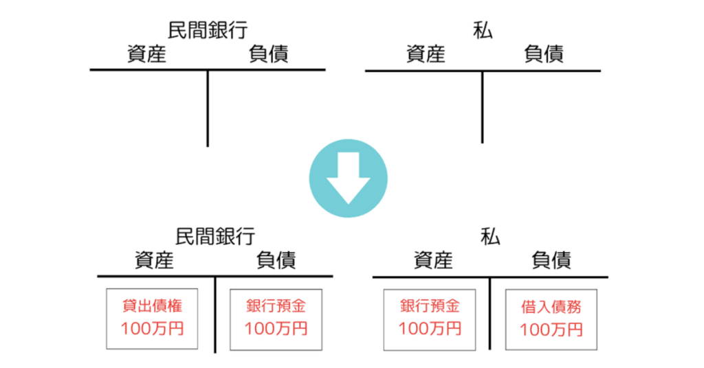 さて、マネーストックの生まれ方は簡単です。民間銀行による日銀からの借り入れがマネタリーベースを生み出したのと全く同じことが、今度は民間主体(家計・企業)による民間銀行からの借り入れで起こるだけだからです。今回はある家計(私)が100万円を借りることとしましょう。