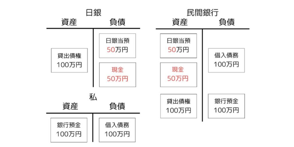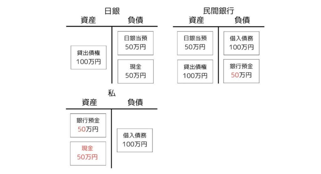 一段階目、まず民間銀行が引き出しに備えて、日銀当座預金100万円のうち50万円を現金として引き出します。銀行の資産である日銀当座預金のうち半分の50万円が現金に変わり、それに応じて、日銀の負債である日銀当座預金の半分が「現金(正確には発行日銀券5」に変わります6。その結果が以下です。変化した部分が赤字です。