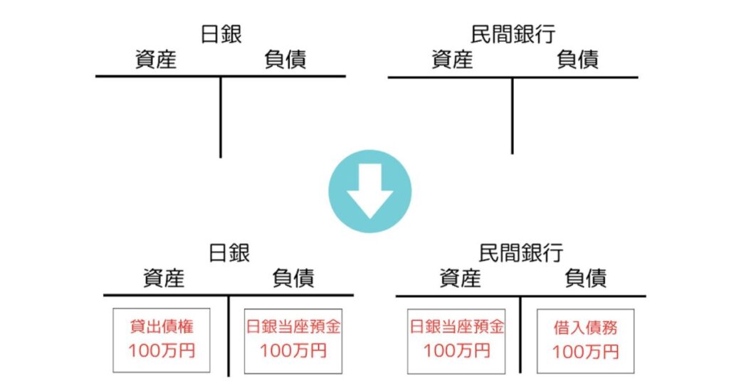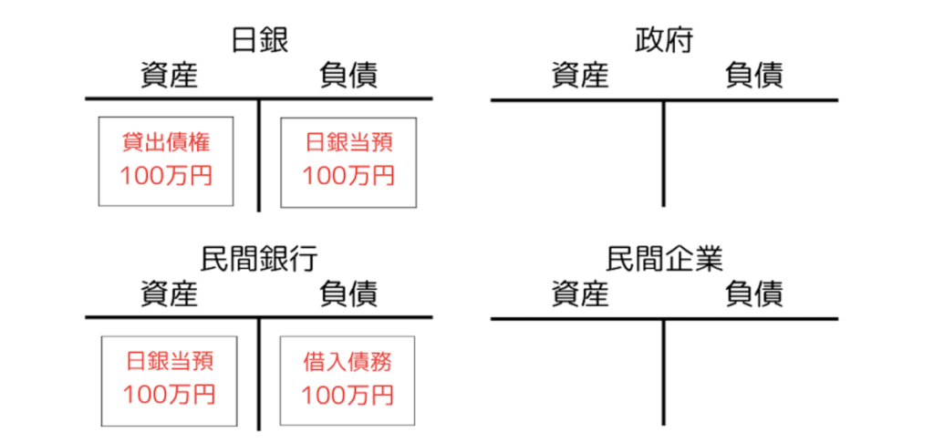 以上から、現行の制度を前提にゼロから出発しようとすれば、円の誕生は、日銀から民間銀行への貸出によると考えざるを得ません。これを図示すると以下のようになります。何もないところから、日銀の資産として貸出債権、負債として日銀当座預金(日銀当預と略されます)、民間銀行の資産として日銀当座預金、負債として借入債務が発生します。今回の貸出金額は100万円としました。このようにして円が初めて生み出されるのです。