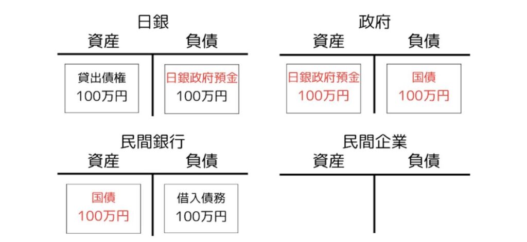 さっき私が100万円を借りたときと似た状況、民間銀行が日銀から100万円を借り、その上で、民間企業が民間銀行から100万円を借りたという状況から出発しましょう。ここで同じ100万円でも、マネタリーベースとマネーストックという形で、それぞれ存在する次元が違うことには改めて注意しましょう。この出発点の図は以下のようになります。