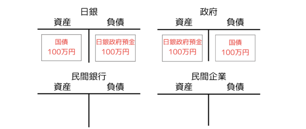政府支出―民間の銀行預金が生まれると同時に、日銀内で政府から銀行への振替が生じる