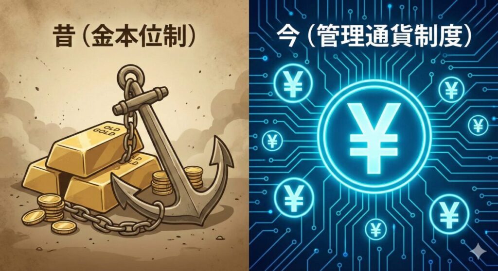 これ、一昔前までは現実に当てはまらない話でした。そのころまでは「金本位制」といって、金(ゴールド)が本当のお金で、国家の発行する硬貨や紙幣はその代用品という扱いでした。国は、紙幣が持ち込まれたらゴールドに交換しなくてはならず、だから好き勝手にお金を発行できなかったのです。あまり発行しすぎると交換するためのゴールドがなくなってしまうからです。