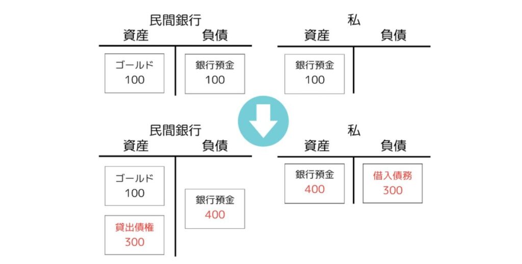 他方で、ゴールドを脇役へと押しやった銀行貨幣の独立性に基づき、信用創造を行う、つまり、信用貨幣に基づいて銀行貨幣を発行するとどうなるでしょうか。仮に300単位の銀行貨幣を発行したとしましょう。