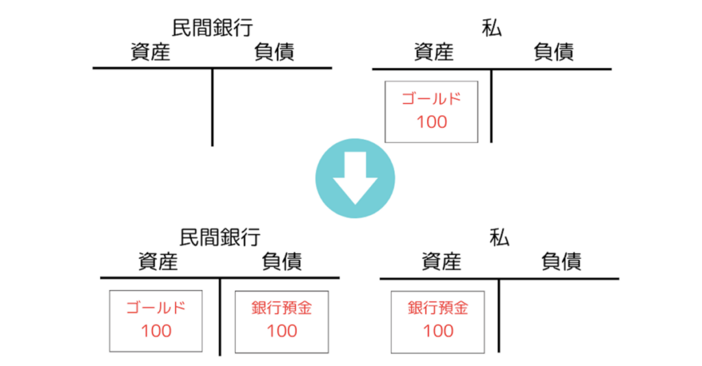 ここで個人間の債権債務関係が、すべて個人と銀行の間の債権債務関係に変換されています。銀行がAさんとBさんの借用証書を所持しており、AさんとBさんは銀行の借用証書である銀行預金を所持しています。
